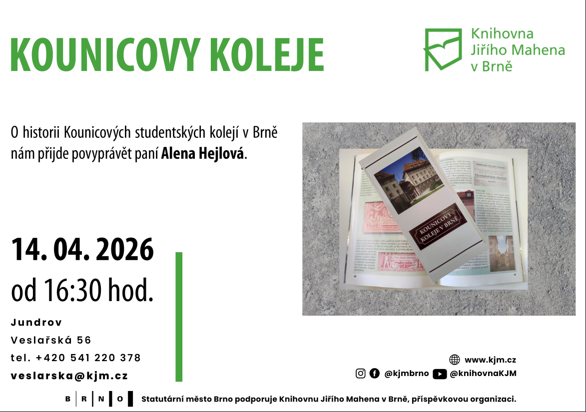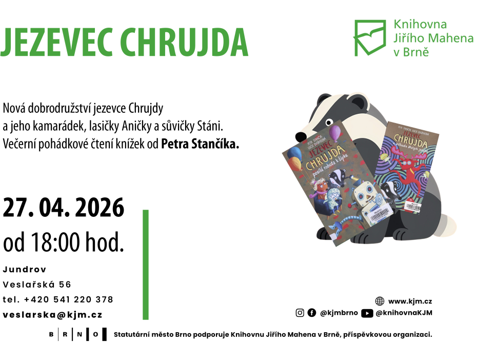 Alena Hejlová povypráví o historii Kounicových kolejí v Brně a na večerním pohádkovém čtení se dozvíte o nových dobrodružstvích jezevce Chrujdy.