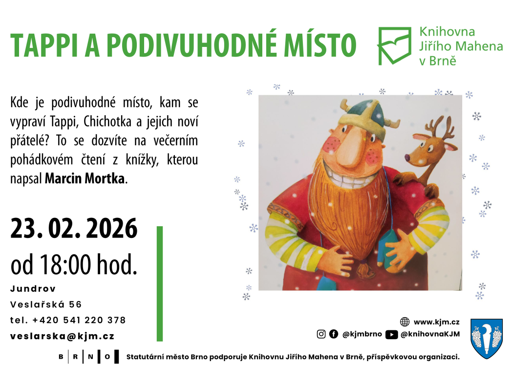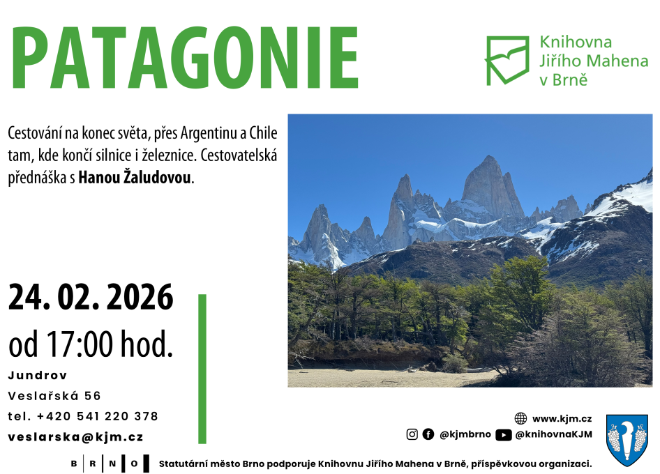 Výstava výtvarných prací - 2. února - 27. února 2026, večerní pohádkové čtení - Tappi a podivuhodné místo - 23. února 2026, přednáška o Patagonii 24. února 2026.
