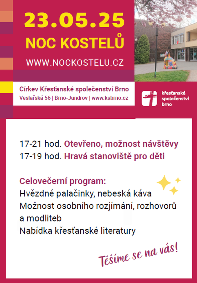 Církev Křesťanské společenství Brno, Veslařská 56 zve na Noc kostelů.
