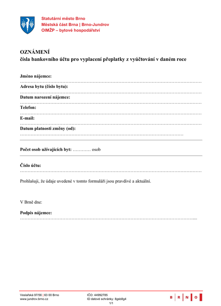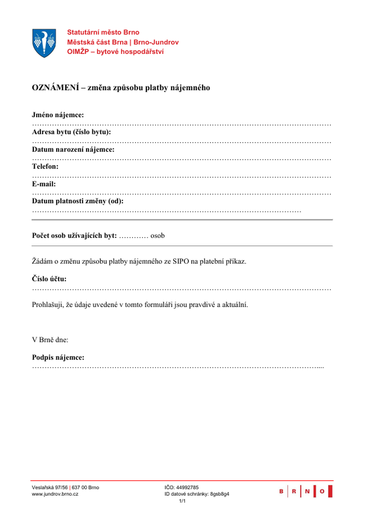 Oznámení o změně způsobu platby nájemného a č. ú. pro přeplatky